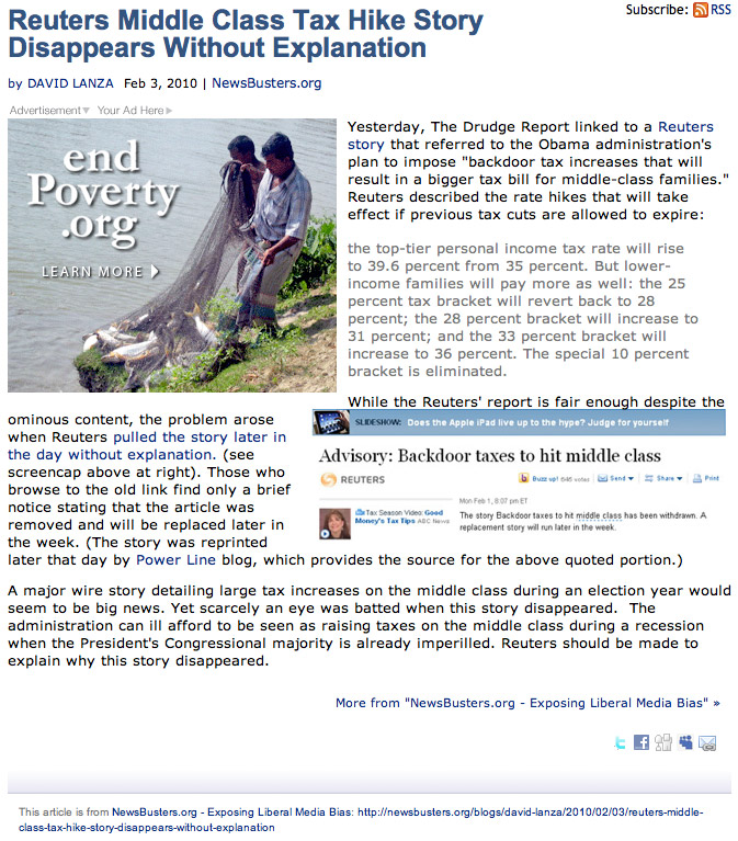 A major wire story detailing large tax increases on the middle class during an election year would seem to be big news. Yet scarcely an eye was batted when this story disappeared. The administration can ill afford to be seen as raising taxes on the middle class during a recession when the President’s Congressional majority is already imperilled. Reuters should be made to explain why this story disappeared.