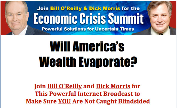 A June 3 email sent to Newsmax’s mailing list promotes something called the “Economic Crisis Summit,” starring Morris (of course), but also “Premier Guest” Bill O’Reilly.