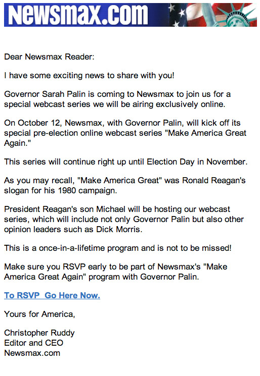 Newsmax sent out an email today to its mailing list touting the presence of Sarah Palin in “a special pre-election webcast series we will be airing exclusively online” starting October 12. According to the email, the webcast, to be called “Make America Great Again,” will be hosted by Michael Reagan and feature Palin as well as “other opinion leaders such as Dick Morris.”
