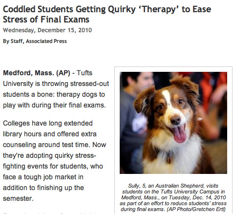 A Dec. 15 Associated Press article on Tufts University providing therapy dogs to stressed-out students during final exams, was released with the headline “Tufts Uses Dogs To Ease Student Exam Stress.” But that’s not the headline CNS put on its copy of the article; it went with “Coddled Students Getting Quirky ‘Therapy’ to Ease Stress of Final Exams.”