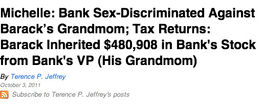 In case Jeffrey’s slyly accusatory writing wasn’t obvious enough, his overly long headline drove his bogus accusation home: “Michelle: Bank Sex-Discriminated Against Barack’s Grandmom; Tax Returns: Barack Inherited $480,908 in Bank’s Stock from Bank’s VP (His Grandmom).”