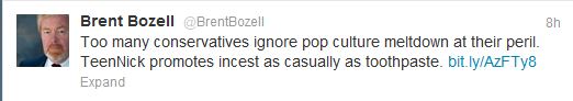 MRC chief Brent Bozell, of course, regurgitates this error on his Twitter page, declaring that “TeenNick promotes incest as casually as toothpaste.”