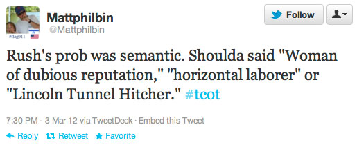 Meanwhile, MRC employee Matt Philbin — who had previously said he wanted to send Fluke “a big Costco-sized box of condoms” — keeps up Limbaugh’s slander by tweeting, “Rush’s prob was semantic. Shoulda said ‘Woman of dubious reputation,’ ‘horizontal laborer’ or ‘Lincoln Tunnel Hitcher.'”