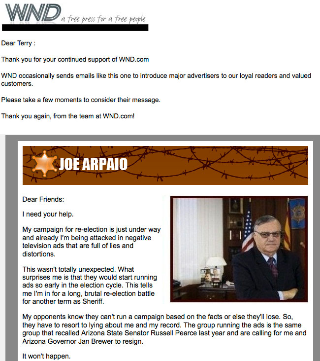 Arpaio is running for re-election as Maricopa County sheriff, and his campaign rented out WND’s mailing list Monday to send an email soliciting donations. It reads like it was ripped from Jerome Corsi articles–like Corsi, the email complains about how his opponents are “lying about me and my record” and how the Justice Department’s investigation of Arpaio’s office “is nothing but a political stunt aimed at intimidating me from doing the job I was elected to do.”