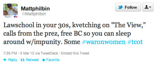 And Philbin is not done sliming Fluke. He has since tweeted: “Lawschool in your 30s, kvetching on “The View,” calls from the prez, free BC so you can sleep around w/impunity. Some #waronwomen.”