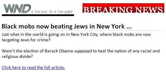 Colin Flaherty’s latest sleazy bit of race-baiting for WorldNetDaily informs us of “several black mob attacks on – and robberies of – Jewish people in Brooklyn over the last two years, leaving broken bones and life-threatening injuries in their wake.” Time to race-bait, Colin: