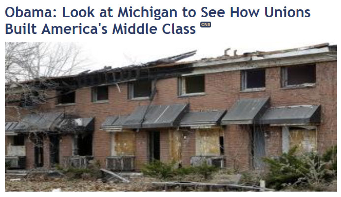 A Dec. 10 article by Fred Lucas headlined “Obama: Look at Michigan to See How Unions Built America’s Middle Class” is illustrated with a picture of abandoned housing.