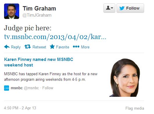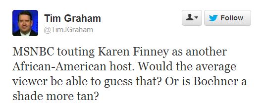 Yes, the Media Research Center’s Tim Graham really did tweet his pondering of whether “the average viewer” of MSNBC would be able to tell that newly minted MSNBC host Karen Finney is African-American and his suggestion that John Boehner may be darker: