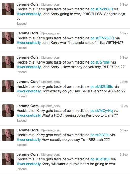 The spectacle of Secretary of State John Kerry trying to sell members of Congress on taking action against Syria for using chemical weapons sent Corsi into a paroxysm of attempted schadenfreude, and he spewed his venom into a series of tweets in which he mocks Kerry’s Vietnam War heroism and the pronunciation of Kerry’s wife’s name: