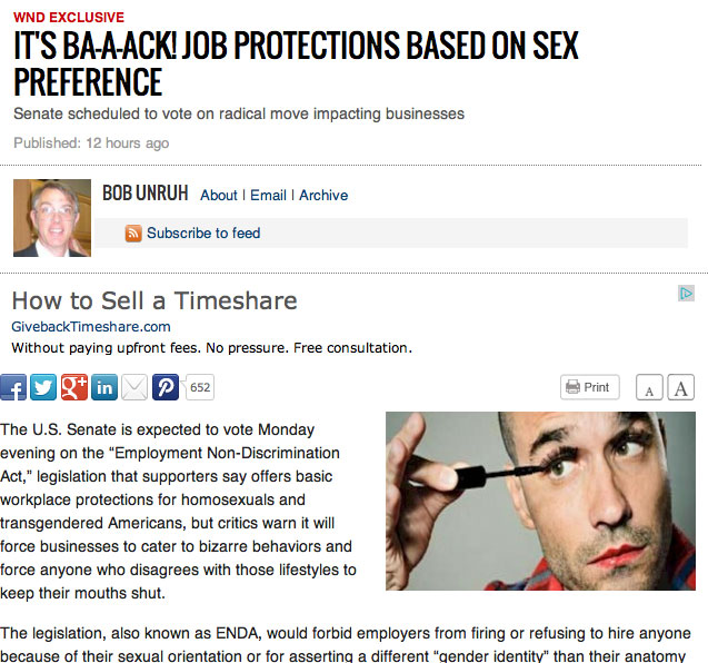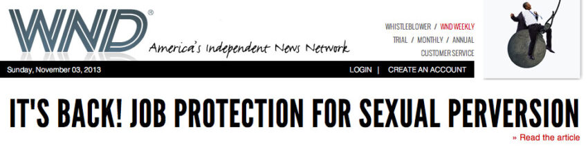 Bob Unruh’s Nov. 2 WorldNetDaily article on the proposed Employment Non-Discrimination Act is headlined “It’s ba-a-ack! Job protections based on sexual preference.” But that’s not it’s promoted on WND’s front page –that one reads “It’s back! Job protections based on sexual perversion.”