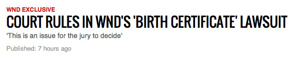 The headline on WND’s Nov. 26 article on its lawsuit against Esquire magazine is laughably vague: “Court rules in WND’s ‘birth certificate’ lawsuit; ‘This is an issue for the jury to decide.'”