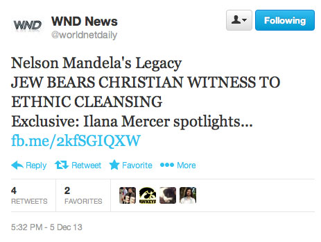 Following the death of Nelson Mandela, WorldNetDaily sent out a tweet stating: “Nelson Mandela’s Legacy: JEW BEARS CHRISTIAN WITNESS TO ETHNIC CLEANSING.”