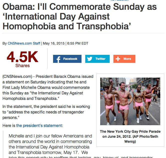 On May 16, CNS published an article (curiously credited only to “CNSNews.com Staff”) about how President Obama is “marking the International Day Against Homophobia and Transphobia.” Accompanying the photo is a three-year-old picture described as being taken from “The New York City Gay Pride Parade” featuring men dressed only in pink shorts.