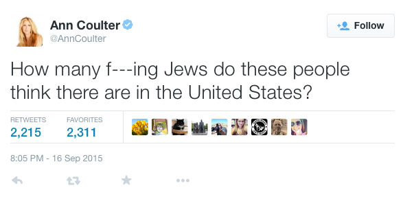All of this made us wonder how the MRC would react to Coulter’s Twitter rant complaining about Republican presidential candidates pandering to Israel, adding, “How many f—ing Jews do these people think there are in the United States?”