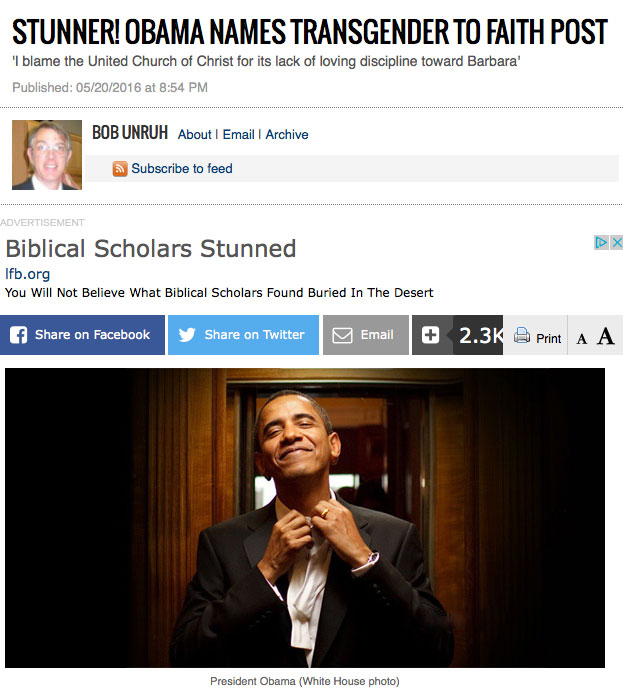 Thus, Obama’s appointment of transgender woman Barbara Satin to the president’s Advisory Council on Faith-Based and Neighborhood Partnerships tripped that trigger. A “news” article on the appointment by WND lackey Bob Unruh couldn’t even make out of the second paragraph before quoting a screed by an obscure right-wing blogger declaring that Satin is “mentally sick.” Unruh somehow neglects to mention that the writer of said screed also referred to Obama as “Barack Hussein Obama Soetoro Sobarkah,” so you know his credibility is completely unassailable.