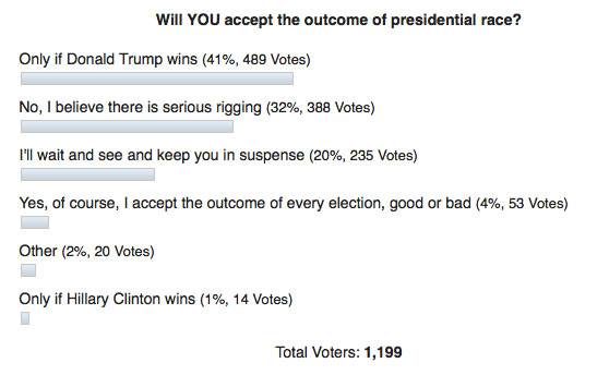 As you can see, nearly three-fourths of WND readers either won’t accept the election results at all or will accept them only if Donald Trump is declared the winner.