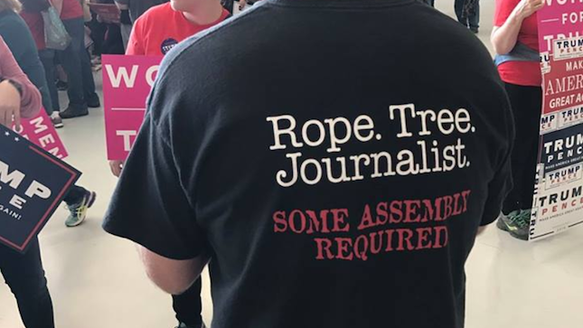 We’re guessing that the MRC will completely ignore the T-shirt of a man at a Trump rally that stated “Rope. Tree. Journalist. Some assembly required.”