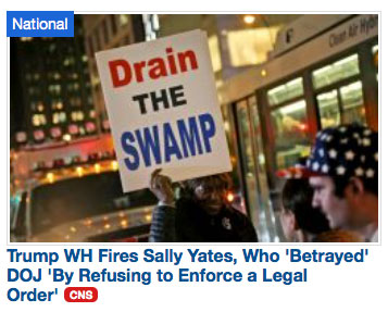 CNS also sided with Trump on the firing of acting attorney general Sally Yates for declining to enforce Trump’s order amid questions about its legality. Jones wrote an article headlined “Trump WH Fires Sally Yates, Who ‘Betrayed’ DOJ ‘By Refusing to Enforce a Legal Order’.” which was illustrated by a protester holding a “Drain the Swamp” poster, indicating CNS’ editorial approval of Yates’ firing.