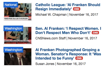 In the eight hours after the news about Franken broke on Nov. 16, CNS cranked out three “news” articles and a blog post on it: