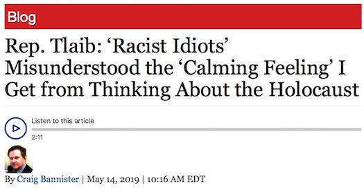 Still, CNS went on to embrace the out-of-context narrative. Craig Bannister fully went there in a May 13 article by claiming that “House Majority Leader Rep. Nancy Pelosi (D-Calif.) and Senator Bernie Sanders (I-Vt.) are calling on President Donald Trump and Republicans to apologize to Rep. Rashida Tlaib (D-Mich.) for criticizing her comment that she gets ‘a calming feeling’ from thinking about the Holocaust.”