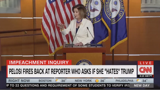 Nicholas Fondacaro unsurprisingly took Rosen’s side, pejoratively declaring that Pelosi’s “anger flared as she lashed out in response (something they would have condemned President Trump for),” going on to complain about media coverage of the incident: “When President Trump slammed the press, it was a destructive attack on the First Amendment, our institutions, and our democracy. But when Pelosi did it, it was considered her just flexing her power.”