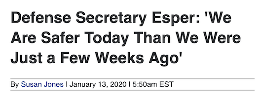 Jones and CNS dedicated no other article to Esper’s interview. Which means that Jones was writing around its big revelation, that Esper admitted he didn’t see any evidence of what Trump portray as an imminent threat from Soleimani to attack as many as four U.S. embassies.
