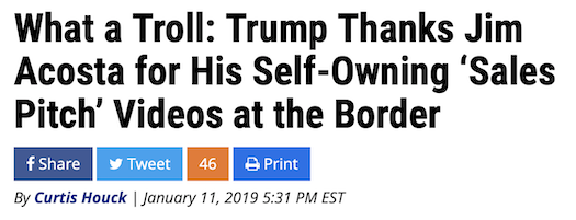 Whitlock seems a bit put out that trolling gets criticized — at least when those trolls advance the MRC’s agenda. Indeed, it was just a year ago that Whitlock’s MRC colleague Curtis Houck gushed over how President Trump unleashed “a trollish tweet for the ages that united people across the right side of the aisle against the media for a day-long dunk squad session” by attacking CNN’s Jim Acosta (a frequent target of Houck’s CNN Derangement Syndrome).