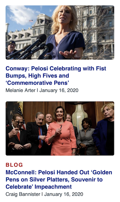 A mere six minutes later, at 112:33 a.m., Craig Bannister deliver a blog post under the headline “McConnell: Pelosi Handed Out ‘Golden Pens on Silver Platters, Souvenir to Celebrate’ Impeachment“: