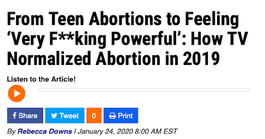 Downs’ definition of “promoting” abortion is when a female character is not shamed or stigmatized for having one. For instance, she complains that one character’s admission that she had an abortion as a teenager is an example of how “teen abortions are pushed.” She even attacked shows with more instances of non-judgmental treatment of abortion as “repeat offenders.”