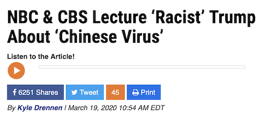 - On Thursday, the NBC and CBS morning shows kept pushing the narrative that President Trump’s use of the phrase “Chinese virus” was “racist” and endangering people. NBC even attempted to claim that China “helped” the rest of the world by “delaying” the spread of coronavirus. … The reporter never bothered to mention the President’s explanation for using the term was about holding China’s authoritarian government accountable for its dishonesty about the initial spread of the virus – not a racial statement.– Kyle Drennen, March 19
