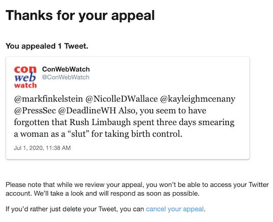 We appealed the suspension — but after more than two weeks of waiting, we heard nothing from Twitter about the appeal, during which our account was suspended and we were unable to post anything to it. Because the delay has hurt our mission to report on right-wing media, we have canceled our appeal and deleted the tweet in question in order to regain control of our account.