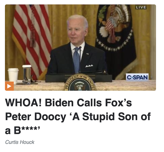 The Media Research Center — led by Curtis Houck — has spent the past year being embarrassingly fawning over Fox News reporter Peter Doocy’s biased, hostile questions at Jen Psaki’s White House press briefings. Most recently, Houck fawned again over the hostile questions Doocy fired at President Biden. So when Biden muttered a few days later that Doocy was a “stupid son of a bitch,” you know the MRC had days of manufactured outrage to come over it (despite its embrace of the “Let’s Go Brandon” insult and cheering Joe Rogan calling Brian Stelter a “motherf*cker”).Houck kicked off the faux outrage by setting the scene: