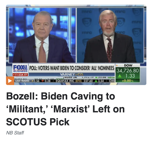 From there, the MRC’s job was to denigrate anyone President Biden would nominate to take Breyer’s place as irredeemably liberal and radical — based solely upon Biden’s promise to nominate a black woman to fill his first Supreme Court vacancy. That narrative was so important to bet out there, MRC chief Brent Bozell did it himself in an appearance on Fox Business: