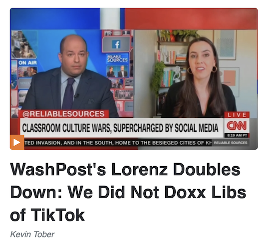 On Sunday, leftist sleazebag and professional victim Taylor Lorenz of The Washington Post appeared on CNN’s Reliable Sources to double down on her lie that she never doxxed the woman behind the popular Twitter account Libs of TikTok. Which is a bald-faced lie.
