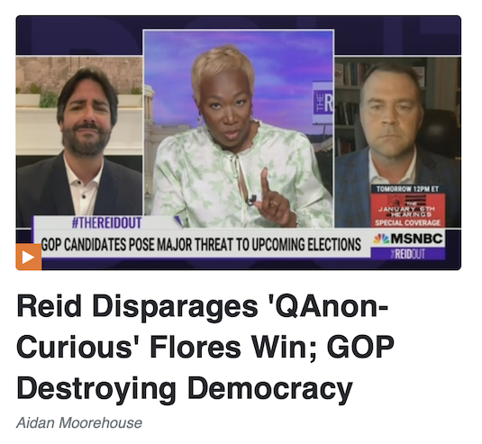 However, Houck and Fondacaro were censoring the fact that Flores is much farther to the right than they would have readers believe: Flores used QAnon hashtags in posts on Facebook and Instagram, despite hollow denials that she’s a conspiracy theory enthusiast. When MSNBC’s Joy Reid pointed out this inconvenient fact and called her “QAnon-curious,” it was up to Aidan Moorehouse to go into damage-control mode and pretend her denials were meaningful in a June 16 post: