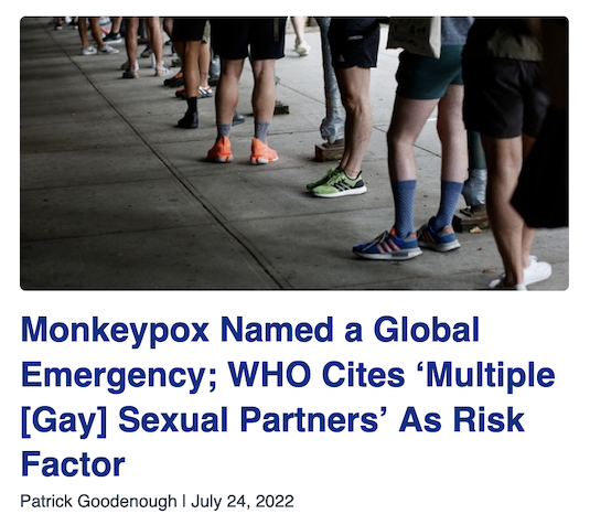 The article’s rubbed in further, stating: “Monkeypox Named a Global Emergency; WHO Cites ‘Multiple [Gay] Sexual Partners’ As Risk Factor.” In fact, WHO did not use the word “gay”; CNS inserted it, presumably to make gay people appear more evil.
