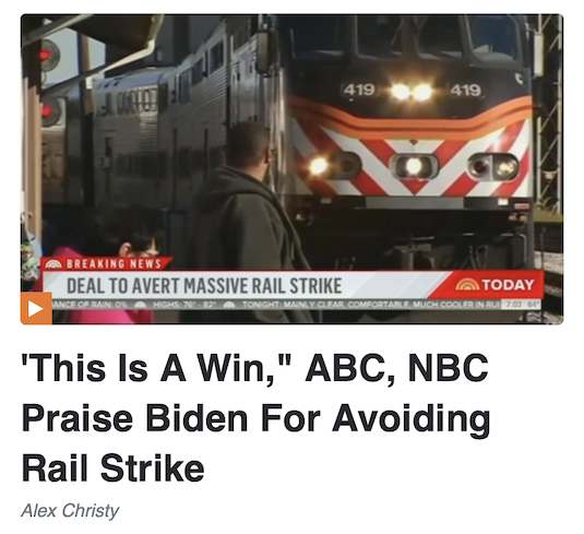 […]Of course Biden aides give Biden credit. A better description of events was provided by CBS’s Ed O’Keefe who was more matter-of-fact. On CBS Mornings, O’Keefe reported, “President Biden announcing the deal earlier this morning saying in a statement ‘these rail workers will get better pay, improved working conditions, and peace of mind around their health care costs. All hard-earned.’ A handful of the dozen railroad unions had been holding out for a better agreement on sick leave. They had until tonight at midnight to reach a deal or cause a strike that would have affected almost 7,000 trains across the country.”