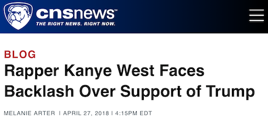 West didn’t surface again at CNS until 2018, when he voiced his support for Trump. An April 2018 article by Michael Morris quoted right-wing talking head Ben Shapiro asserting that West support of Trump “might actually matter” because it might draw support of Black people to Republicans.An article by Arter a few days later lamented that West “is facing continued backlash over his support for President Donald Trump and for recently voicing support for black conservative commentator Candace Owens.” It then published a May 2018 column by Shaprio voicing his full support of West’s support of Trump: