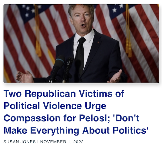 Mimicking its Media Research Center parent, CNSNews.com reacted to the violent hammer attack on Paul Pelosi, husband of House Speaker Nancy Pelosi, by complaining that Republican anti-Pelosi rhetoric was being blamed mixed with whataboutism. The first article referencing the attack was an Oct. 31 piece by Susan Jones complaining that a Democratic senator referenced “election deniers” in condemning the attack: