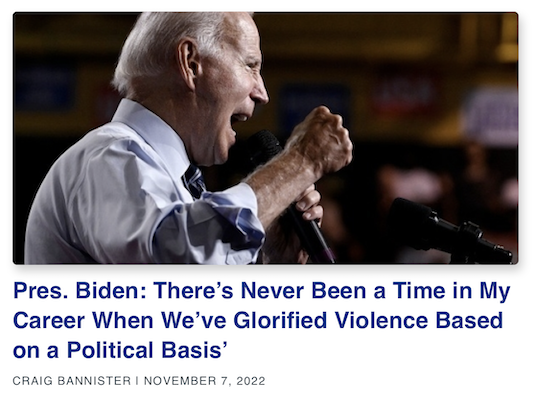 Jones used a Nov. 7 article to hype Biden’s response to a question in which he called for “no more drilling” and replacing coal plants with wind and solar. She then blockquoted Democratic Sen. Joe Manchin’s “blistering response to Biden’s remarks about coal,” then added that “As with many of Biden’s remarks, the White House tried to walk back the one about coal plants.” We don’t recall CNS ever promoting walkbacks of remarks made by Donald Trump. We’ve already noted how Craig Bannister used a diferent Nov. 7 article to criticize Biden denouncing the violent attack on Paul Pelosi by claiming that he was “ignoring times in recent years when prominent Democrats have been criticized” for glorifying violence.