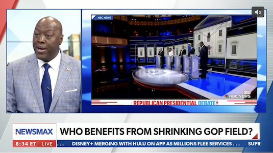 Newsmax’s original debate-related coverage was focused more on trashing the debate itself and touting the candidate who wasn’t there (though it did let Ron DeSantis make a TV appearance to tout his “momentum” after the debate, which didn’t age terribly well considering he’d drop out of the race a month or so later). Michael Katz did some creative math in a Dec. 7 article to bash the debate’s ratings: