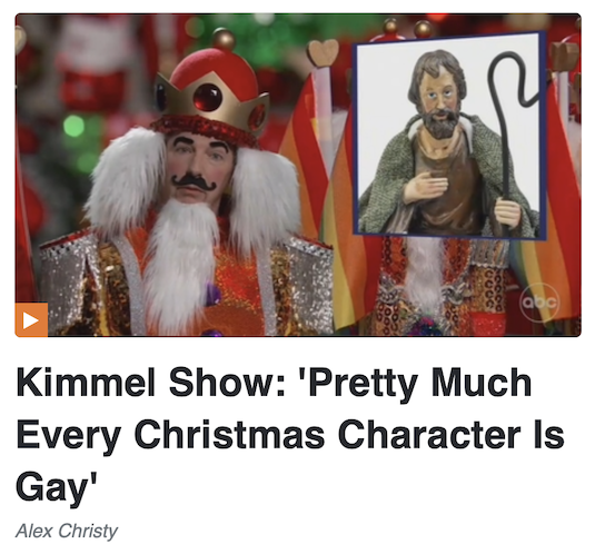 On Monday, The Daily Show proclaimed that Christmas was the “queerest holiday of all,” on Tuesday it was ABC’s Jimmy Kimmel’s turn as he “interviewed” Sean Hayes, who was playing the role of a gay nutcracker. Hayes claimed that “pretty much every Christmas character is gay” and like The Daily Show, he including Joseph from the Nativity.