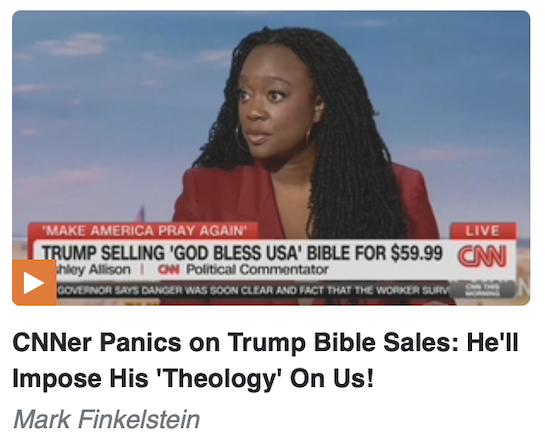 You’d think the self-proclaimed Christians like those at the Media Research Center would be offended by Donald Trump — a thrice-married rapist and adulterer — endorsing a Bible. Instead, it’s mad that other people have criticized it. Mark Finkelstein groused in a March 27 post: