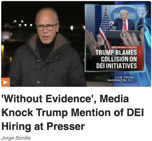 With President Trump back in office, the hostile media have gone back to showing interest in presidential assertions made “without evidence”. This Trump coverage classic made its return as the media melted down over Trump calling out hiring practices at the FAA that placed a heavy emphasis on diversity, equity, and inclusion (DEI). In so doing, the media actually ignored a ton of evidence.