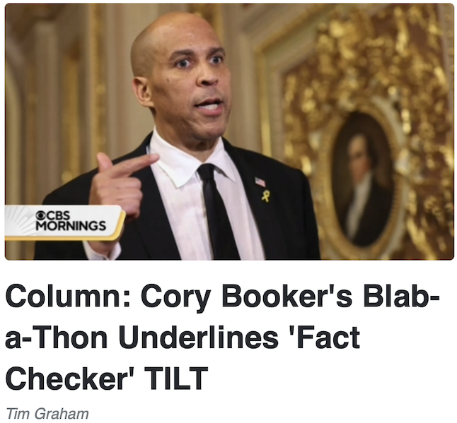But what about the other 25 hours of statements? Were they entirely factual? Don’t count on PolitiFact for a ruling, because they are in the tank for Cory Booker. He’s received five “True” ratings in a row dating back to 2019.