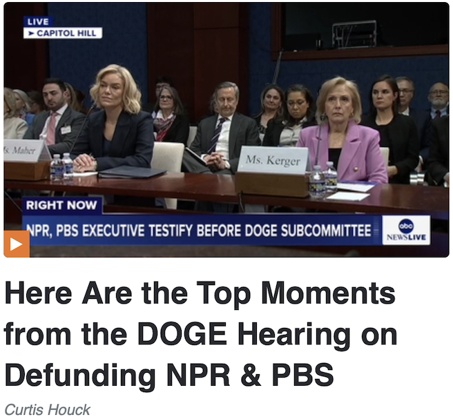 PBS leader Paula Kerger and NPR leader Katherine Maher were supposedly preparing for this, reported The New York Times: “Ms. Kerger said she was preparing for the hearing by reviewing her testimony with legal counsel. Ms. Maher told staff members last month that she was preparing with so-called murder boards, rigorous question-and-answer sessions that aim to expose potential weaknesses.”