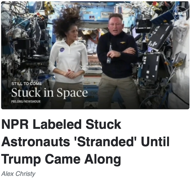 Christy didn’t explain how he could read Trump’s mind on his word usage, and he didn’t mention the fact that the astronauts have been quite vocal about not feeling “abandoned.” Instead, he whined: “While Williams can be commended for her ability to adapt in the face of adversity and put a happy face on the situation, there is no reason why Dickerson and CBS need to change their tune on how they described her and Wilmore just because Trump commented on it.”