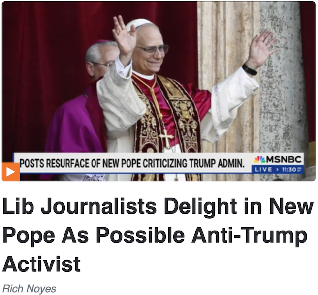 Rich Noyes grumbled that “liberal journalists took special delight in evidence that the new Pope — just like his predecessor — seems to disagree with the Trump administration on issues like immigration.” However he cited only one actual journalist, with the other person being MSNBC’s Chris Hayes. Christy insisted that an MSNBC commentator tried “in hilarious fashion” to avoid that the new pope follows Catholic teaching on certain subjects. Noyes returned to grouse that the new pope “has at least some at [CNN] hoping that Leo XIV will be able to get through to Trump in ways that others could not because— wait for it! — he speaks English.”