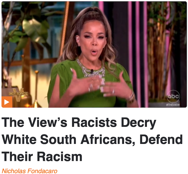 The View’s racism was on full display during the Thursday edition of the unfortunately popular ABC News program. Staunchly racist Sunny Hostin bitterly lashed out at the white South Africans fleeing persecution and parroted the South African president’s denials. And while they denounced America as a racist and sexist country, moderator Whoopi Goldberg defended her and Hostin’s racism.
