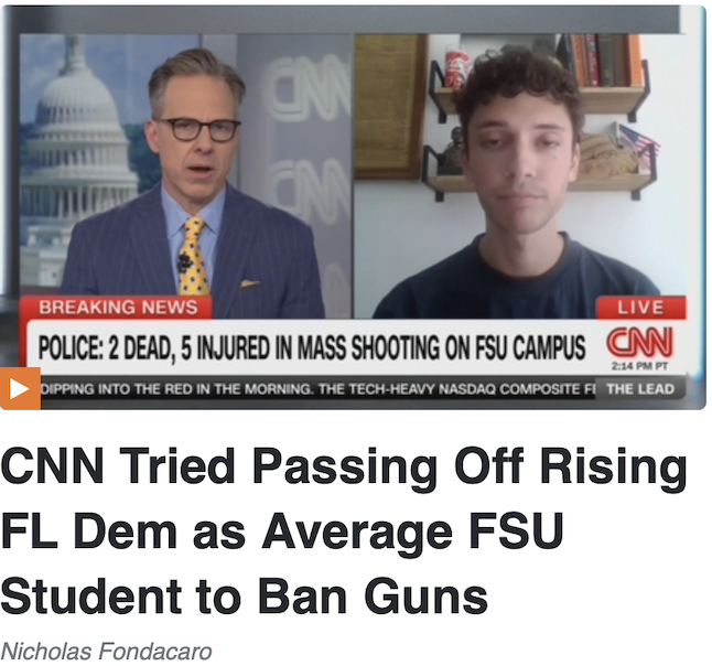 Seemingly itching for another anti-gun show trial like the one he “moderated” after the Parkland shooting (and won an award for), on Thursday, CNN’s Jake Tapper decided to target gun rights by once again exploiting an hours-old school shooting (Florida State University) for political gain. He trotted out 20-year-old Jayden D’Onofrio to be the voice to push for gun control with him. But while Tapper claimed his guest was just an average FSU student, D’Onofrio had a long history of being involved in Democratic Party politics and was even in the running to be the party’s vice chair in the state.